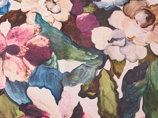The Eden print features painted style blooms with a palette of jewel tones and soft neutrals.